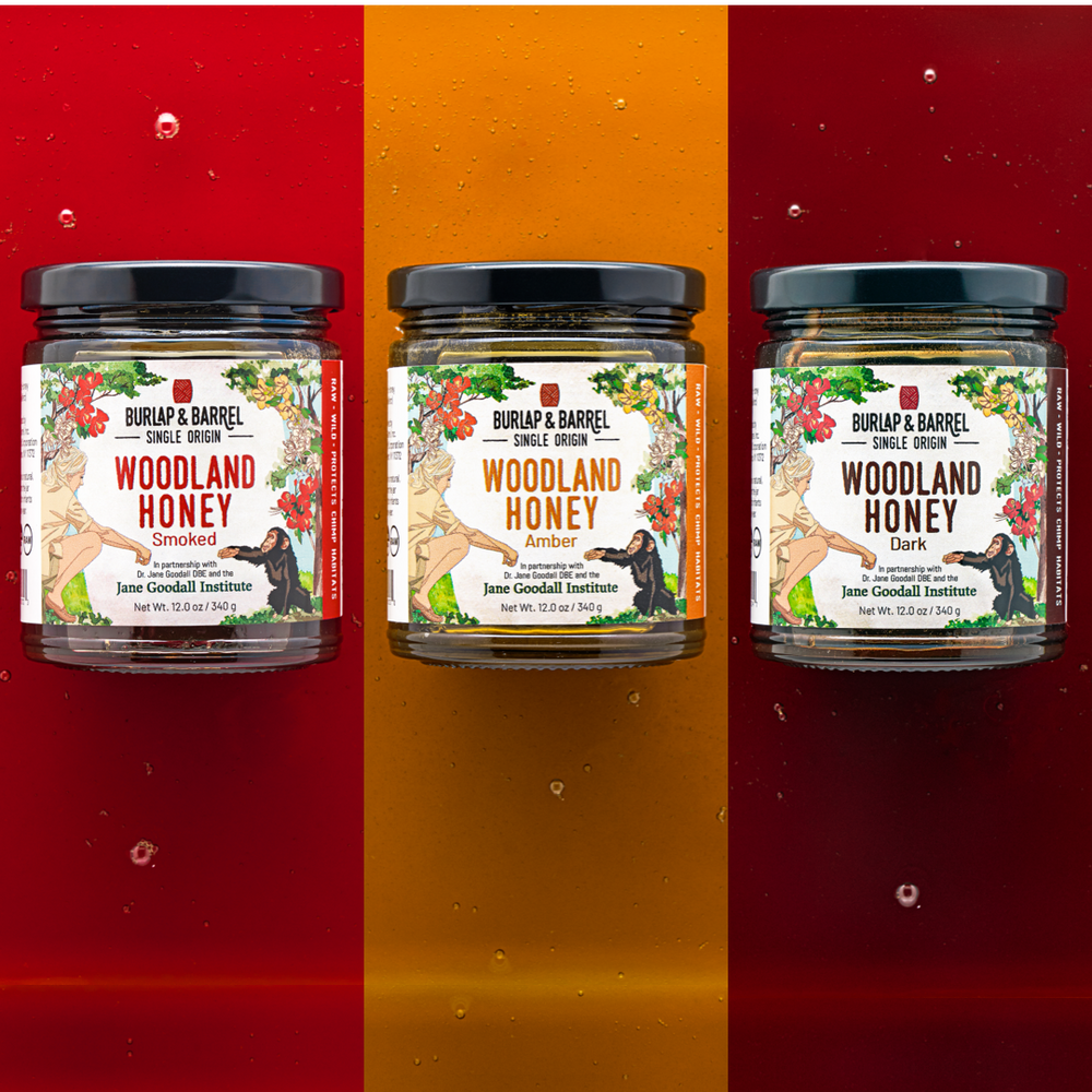Our woodland honeys, made in partnership with Dr. Jane Goodall and The Jane Goodall Institute, are raw, unfiltered and sustainably harvested from the woodlands of Western Tanzania. The woodland honeys’ flavors reflect the incredible biodiversity of the region – they contain nectar from over 30 different species of flowering plants! The honeys have extraordinarily rich flavors that reflect their provenance in the Miombo woodlands of Tanzania, where Dr. Jane Goodall started her trailblazing research of Gombe National Park’s chimpanzees.