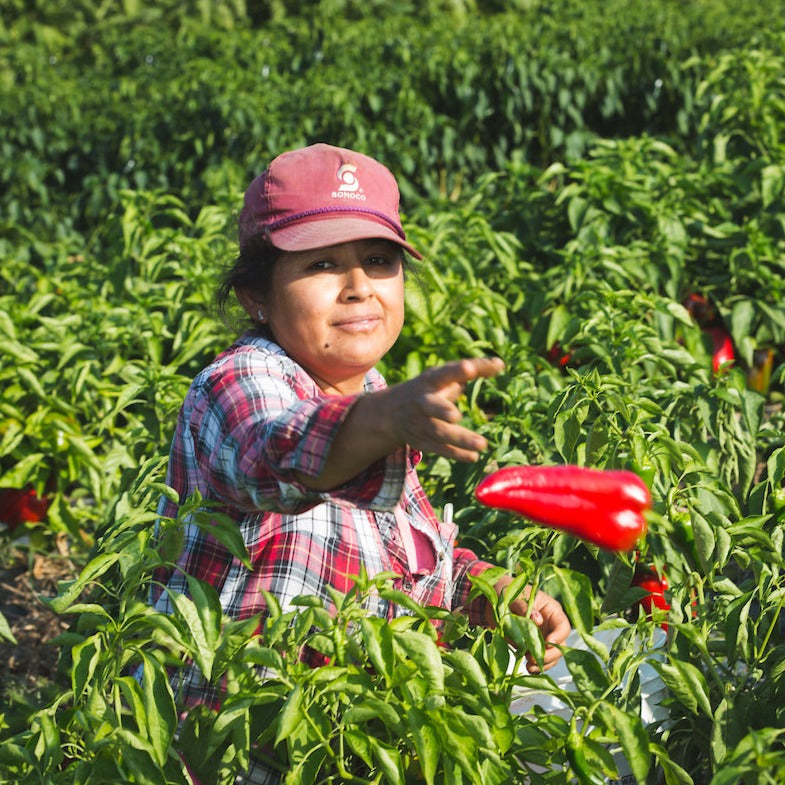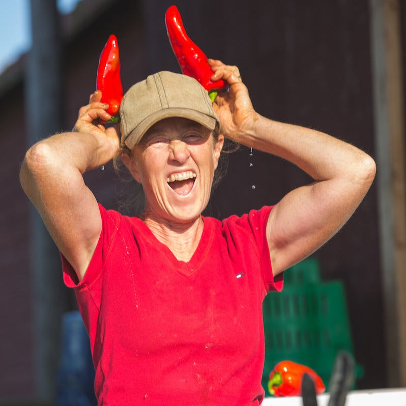 Jodie Emmett and Guillermo Maciel, from Beth's Farm Kitchen, have been working with Sue Decker and Blue Star Farm for the past 7 years. Sue has been growing organic produce for 20 years, and she grew the peppers for this mustard, which are Benicio-approved (see left).