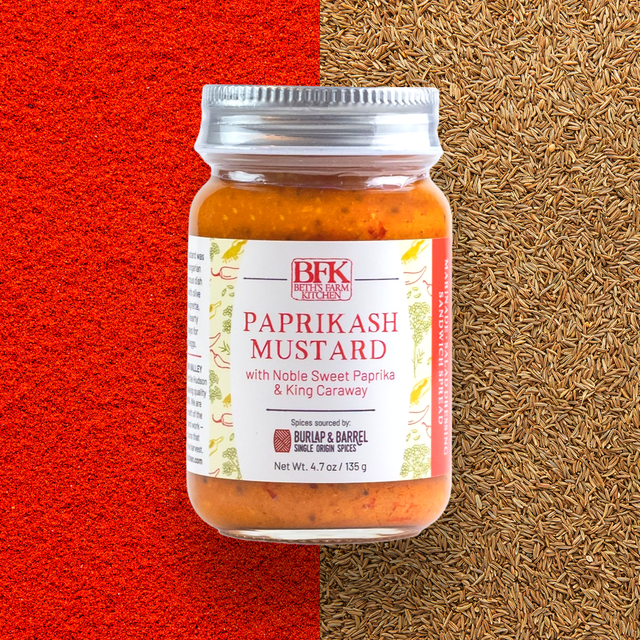 The inspiration for this mustard was Eastern European and Hungarian flavors that are evocative of the famous dish chicken paprikash. The fine folks at Beth’s Farm Kitchen set out to make a mustard that highlighted the sweet pepper flavor from the Noble Sweet Paprika, a little heat from the Szegedi 178 Hot Paprika and earthy sweetness from King Caraway seeds. It's dynamite on potato salad or in deviled eggs, mixed with a little olive oil for a marinade for chicken or vegetables, stirred into a creamy vinaigrette or spread onto a hearty sandwich.