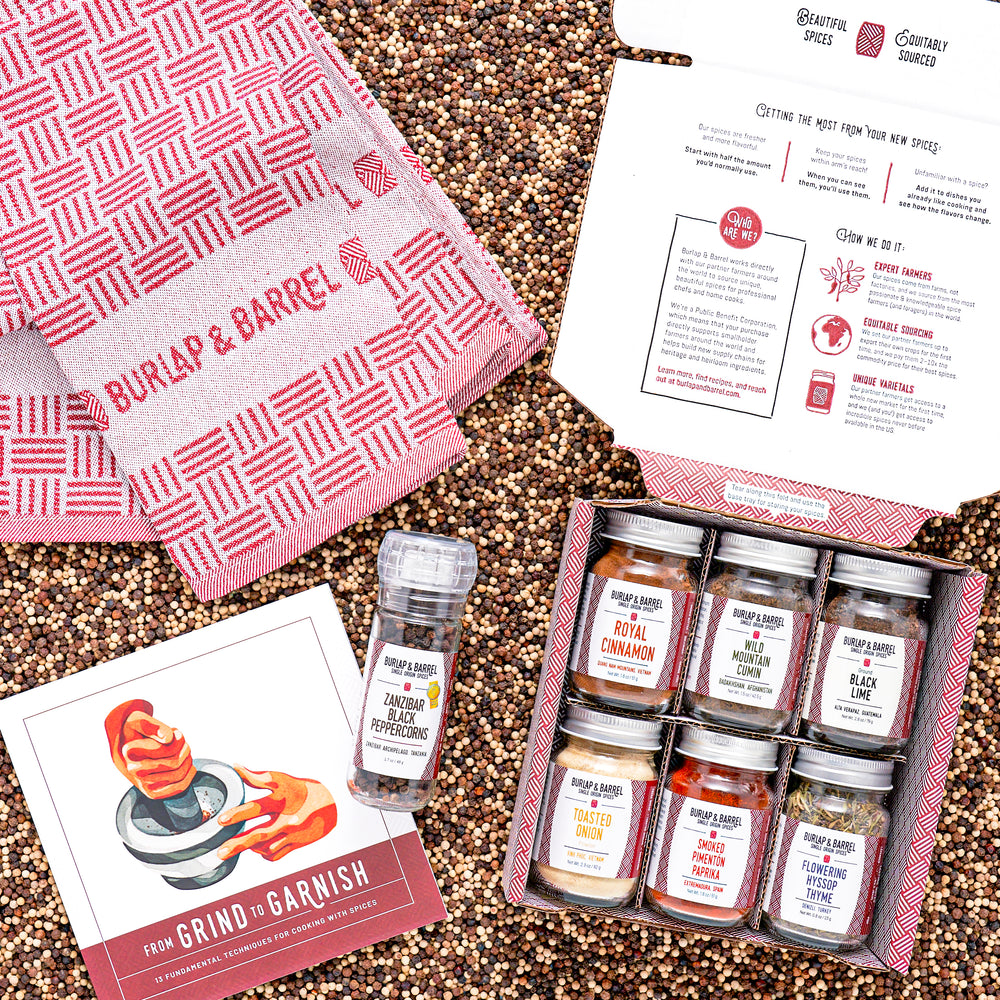 Both sets come with a bonus gift: Our 32-page illustrated guide to cooking with spices, From Grind to Garnish. Packed in a beautiful hand-illustrated cotton gift bag.